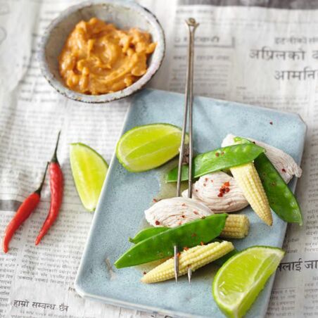 Inzwischen das Hähnchen- oder Putenfleisch kalt abbrausen, trocken tupfen und in dünne Scheiben schneiden . Die Maiskölbchen waschen und schräg halbieren, Zuckerschoten putzen und waschen. Gemüse nacheinander in kochendem Salzwasser bissfest garen, in ein Sieb abgießen, kalt abschrecken und gut abtropfen lassen.