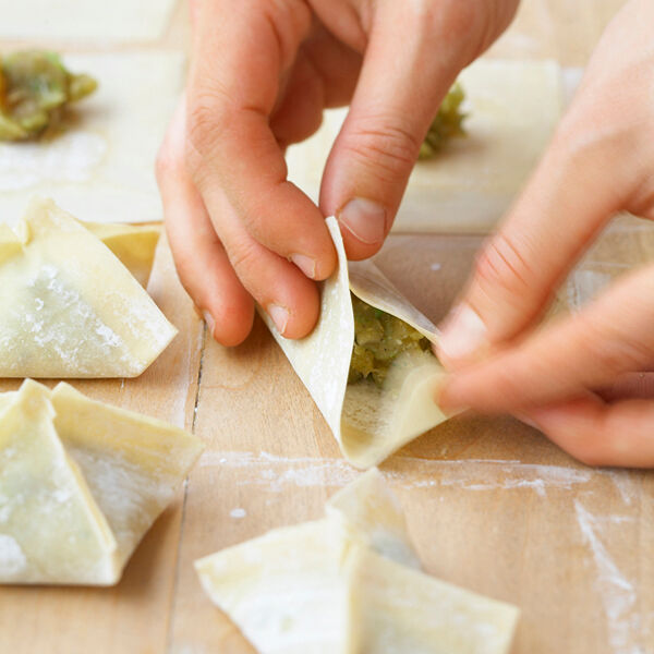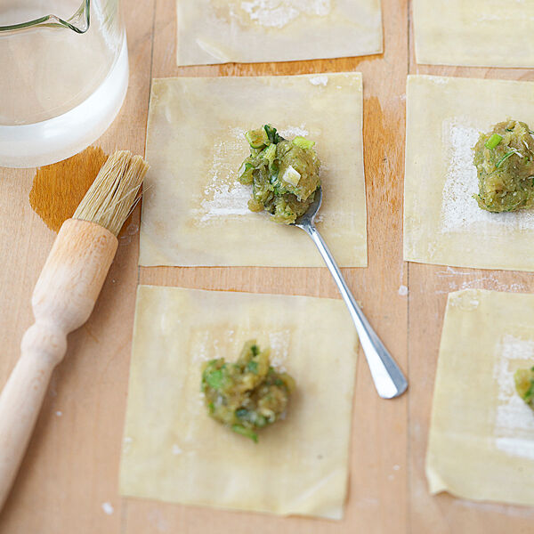 Für die Teigtaschen die Frühlingszwiebeln putzen, waschen und in grobe Röllchen schneiden. Ingwer und Knoblauch schälen und hacken. Das Hähnchenbrustfilet kalt abspülen, trocken tupfen und in Würfel schneiden. Mit Frühlingszwiebeln, Knoblauch, Ingwer und Sojasauce im Blitzhacker nicht zu fein pürieren. Mit Pfeffer und evtl. wenig Salz würzen. Die Teigblätter auf der Arbeitsfläche auslegen, die Ränder leicht mit Wasser bestreichen. Je 1 TL Füllung in die Mitte setzen und die Teigränder über der Füllung zusammendrücken. Zugedeckt kalt stellen.