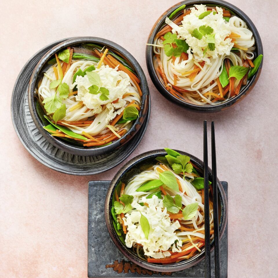 In einem Topf reichlich gesalzenes Wasser zum Kochen bringen. Reisnudeln darin ca. 5 Min. garen, dann in ein Sieb abgießen. Parallel dazu die Gemüsebrühe in einem weiteren Topf zum Kochen bringen und 2 Min. sieden lassen. Die Möhren in die Gemüsebrühe geben und ca. 3 Min. garen.