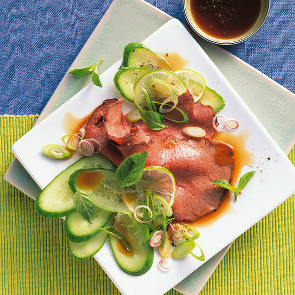 Eine größere Servierplatte mit etwas Sauce bestreichen. Roastbeefscheiben abwechselnd mit Zwiebelringen, Gurken- und Limettenscheiben darauf anrichten. Frühlingszwiebelgrün und Chili darüberstreuen. Die restliche Marinade darüberträufeln. Abgedeckt im Kühlschrank etwa 2 Std. marinieren.