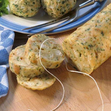 Den Kloß in das kochende Wasser legen und etwa 50 Min. bei schwacher Hitze sieden lassen. Herausheben und aus der Serviette rollen. Mit einem sich überkreuzenden Küchenfaden in Scheiben schneiden.