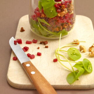 Den Thunfisch häuten und sehr fein würfeln. Die Schalotte schälen und in kleine Würfel schneiden. Die Mango mit einem Sparschäler schälen und zwei Drittel des Fruchtfleischs fein würfeln. Restliche Mango in feine Scheiben schneiden. Die Limette heiß waschen, abtrocknen und die Schale fein abreiben. Den Saft auspressen. Die Chilischote waschen, putzen, Kerne und Trennwände entfernen und fein hacken.