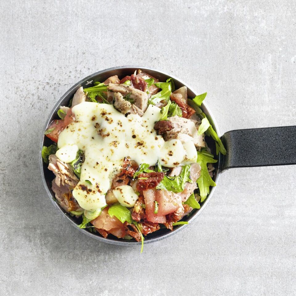 Diese Raclette-Idee begeistert Groß und Klein: Tomaten, Mozzarella, Rucola und Thunfisch beweisen, welch Geschmacks-Dreamteam sie sind.