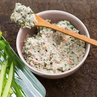 Die Thunfischcreme mit Salz, Pfeffer, 1-2 Spritzern Zitronensaft und den Kräutern würzen. Auf eine Platte geben und glatt streichen. Die Oliven abtropfen lassen und in Scheibchen schneiden. Die Zwiebel schälen und fein würfeln. Die Thunfischcreme mit den Eiern, Oliven und Zwiebeln garnieren und bis zum Servieren kalt stellen.