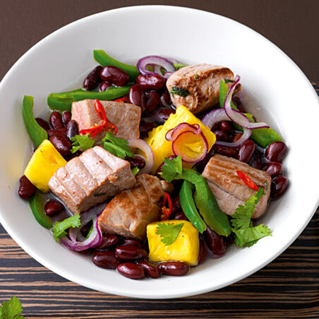 Ausdrucksstark in Geschmack und Optik. Dafür sorgen neben saftigem Thunfischfilet Kidney-Bohnen, Paprika, Ananas – und frischer Chili.