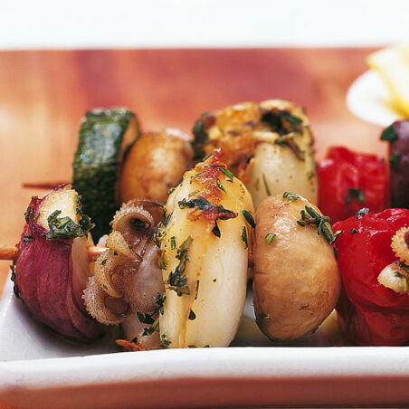 Abwechselnd Gemüse und Tintenfischchen auf die Spieße stecken. Holzkohlen- oder Backofengrill anheizen. Die Spieße auf dem Rost über der Glut oder unter den Grillschlangen (immer etwa 10 Abstand) ungefähr 15 Minuten grillen, bis sie gar und gebräunt sind. Dabei immer mal wieder umdrehen und die Spieße auf dem Holzkohlengrill mit etwas Fischmarinade bepinseln.