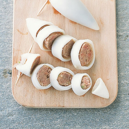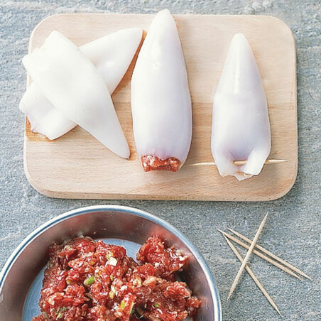 Tintenfische innen und außen waschen und mit Küchenpapier trockentupfen. Mit der Hackfleischfarce füllen und mit Holzspießchen zustecken (Step 1).