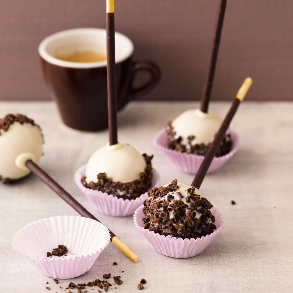 Währenddessen die Kuvertüre hacken und mit dem Kokosfett über dem warmen Wasserbad schmelzen. Die Gebäckstäbchen 1 cm tief in die Kuvertüre tauchen und in die Bällchen stecken. Nochmals 15 Min. kühlen.