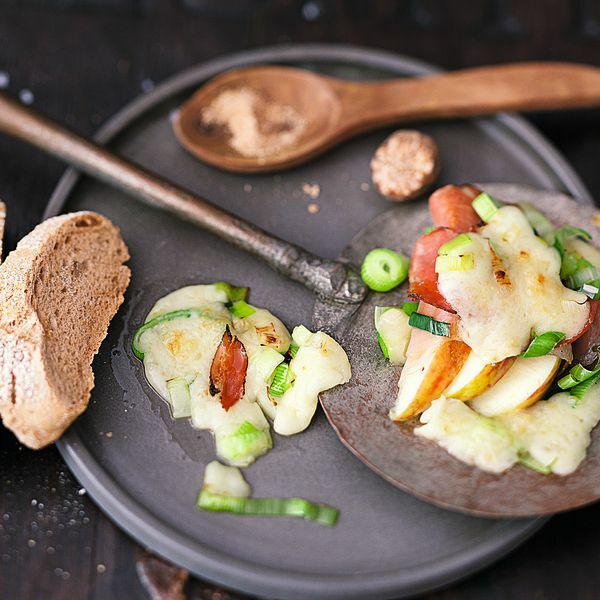 Den Käse in kleine Würfel schneiden, dabei die Rinde entfernen. Die Käsewürfel mit den Lauchringen mischen und kräftig mit Muskatnuss und Pfeffer würzen. Die Käse-Lauch-Mischung in die Pfännchen geben und jeweils 1-2Apfel-Speck-Röllchen in die Mitte setzen. Alles im heißen Gerät ca. 5 Min. erhitzen, bis der Käse geschmolzen und leicht gebräunt ist.