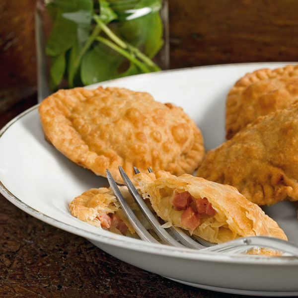 Die knusprigen Teigtaschen werden mit Sauerkraut und würzigem Speck gefüllt. Ideal als kleiner Snack oder als Vorspeise.