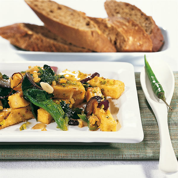 Den Tofu in 1 cm dicke Scheiben und in ebenso dicke Streifen schneiden, salzen. Mandeln, Pinienkerne oder Pistazienkerne fein hacken. Tofustücke damit bestreuen und gut durchmischen.