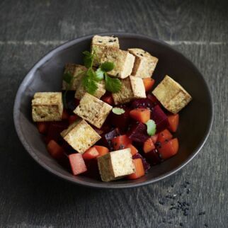 Inzwischen 1 EL Sesamöl in einer beschichteten Pfanne erhitzen und den Tofu darin anbraten, bis er goldbraun ist. Die Tofuwürfel herausnehmen.