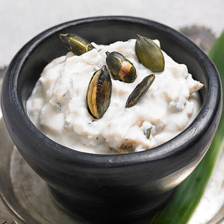 Duftend-krosse Kürbiskerne vermischen sich mit cremigem Tofu zu einem nussigen Brotaufstrich.