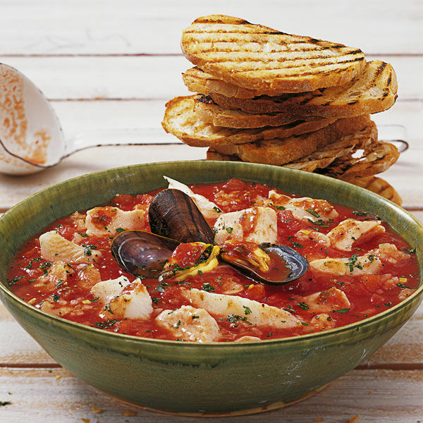 Wenn es mittags oder abends leicht sein soll: mediterranes Suppengedicht mit viererlei Fischfilet und frischen Miesmuscheln.