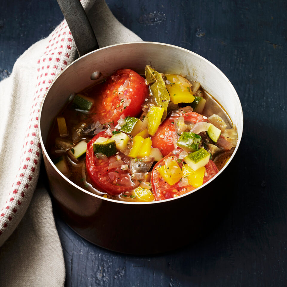 Das Olivenöl in einem Topf erhitzen und Zwiebel, Knoblauch, Rosmarin und Thymian darin leicht mit anschwitzen. Die Tomaten zugeben und diese ebenfalls leicht anschwitzen. Sobald die Tomaten beginnen, Flüssigkeit zu verlieren, das restliche Gemüse zugeben und alles 3 Min. schmoren lassen.