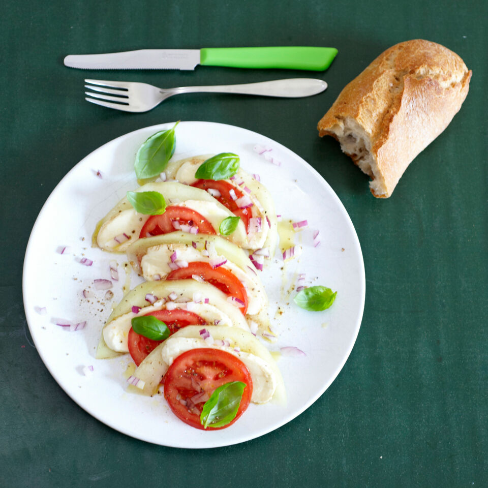 Die fruchtige Caprese schmeckt auch mit Mango oder Feigen anstelle der Melone. Sie ist genau richtig für warme Sommertage.