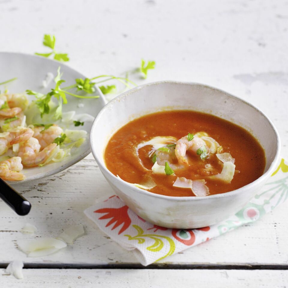 Die Crème fraîche in die Suppe rühren, das Ganze mit dem Stabmixer fein pürieren und mit Salz und Cayennepfeffer abschmecken. Die Suppe in einem tiefen Teller oder einer Schale anrichten, mit dem Garnelen-Mix garnieren. Dazu schmecken knusprige Mais-Tortilla-Chips.