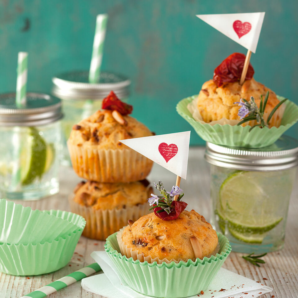 Den Backofen auf 180° vorheizen. Je ein Papierförmchen in die Vertiefungen des Muffinblechs setzen oder die Mulden fetten. Tomaten abtropfen lassen und klein schneiden. Den Parmesan fein reiben, den Knoblauch schälen und fein hacken. 1 TL Pinienkerne beiseitestellen, den Rest in einer Pfanne ohne Fett rösten, bis die Kerne leicht bräunen. Dann aus der Pfanne nehmen und abkühlen lassen. Anschließend 1 EL Öl in die heiße Pfanne geben und den Knoblauch darin andünsten. Den Rosmarin hinzufügen und kurz durchrühren, dann vom Herd nehmen.