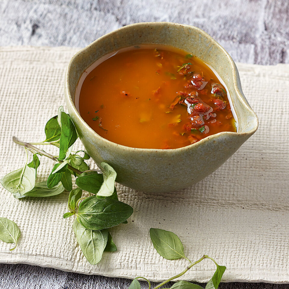 Oregano abbrausen und trocken schütteln, Blättchen abzupfen, fein hacken und mit Salz und Pfeffer zum Dressing geben. Alles nochmals durchschütteln, mindestens 2 Std. durchziehen lassen. Nach Belieben vor dem Weiterverarbeiten durchseihen.