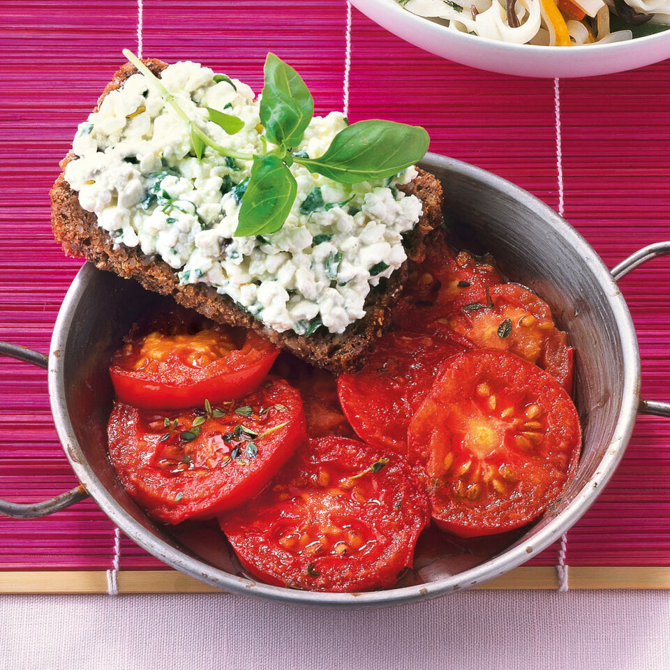 Den Frischkäse mit Salz, Pfeffer, Paprikapulver und Basilikum verrühren. Auf das Brot streichen und zu den Knoblauch-Tomaten essen.