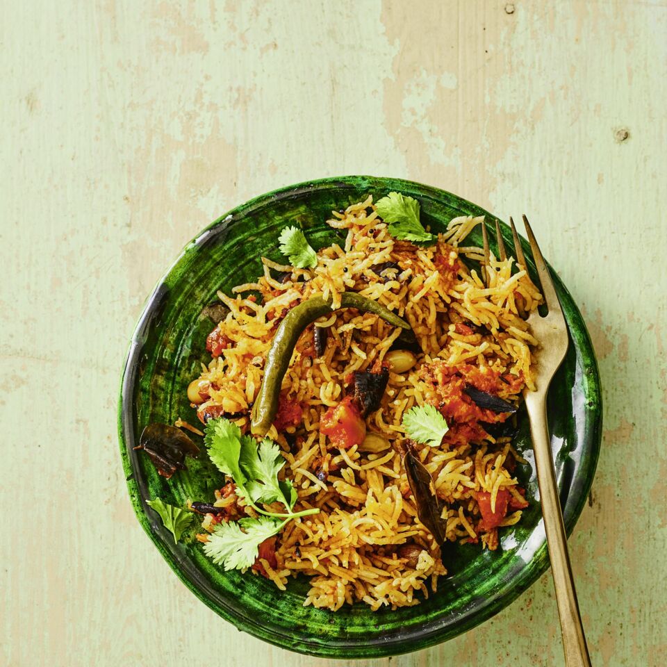 Den Reis samt Einweichwasser und der grünen Chili dazugeben. Einmal umrühren. Deckel auflegen. Sobald der Reis aufkocht, die Hitze reduzieren und den Reis bei mittlerer Hitze ca. 3 Min. köcheln. Die Hitze erneut reduzieren und den Reis bei kleiner Hitze 15 Min. ausquellen lassen. Nicht umrühren. Vor dem Servieren mit Koriandergrün bestreuen. Dazu passen Gemüse- oder Fleischgerichte ohne Sauce wie beispielsweise Fischküchlein oder gefüllte Zucchini.