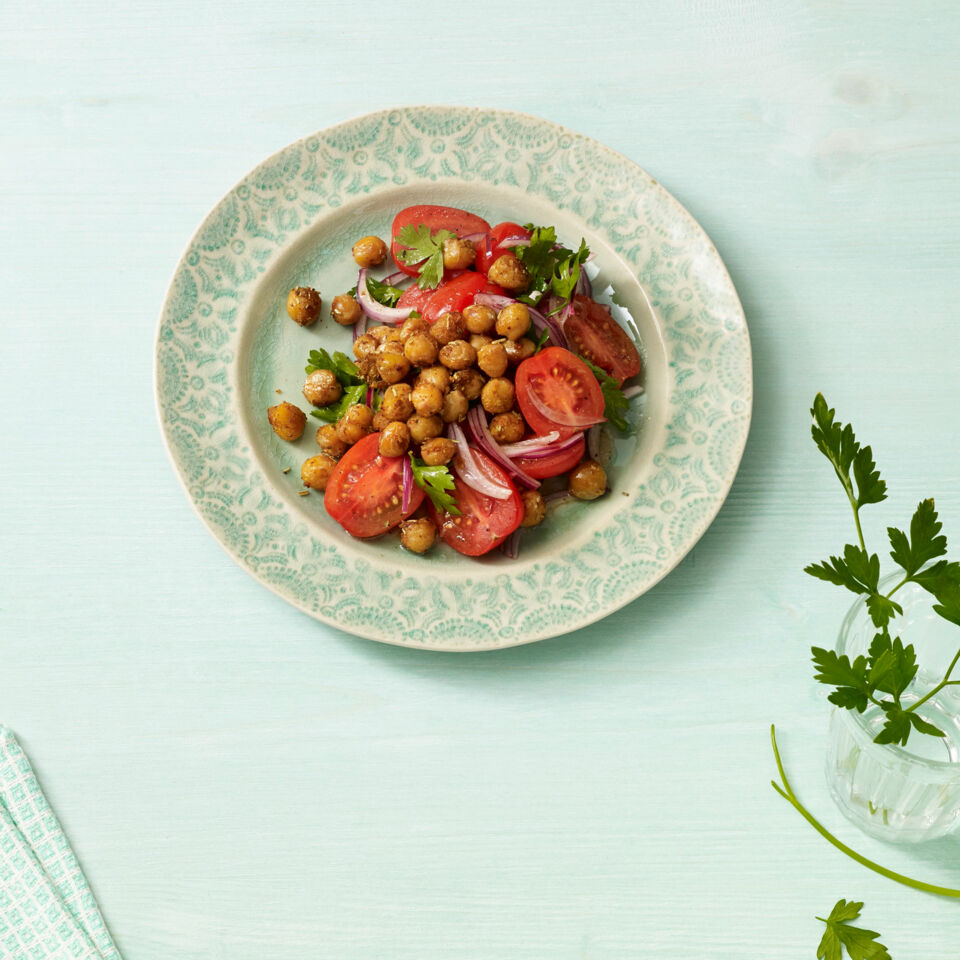 Sommerlicher Aromenmix à la Orient: Tomaten treffen in der Salatschüssel auf gebratene Kichererbsen. Zum perfekten Genuss fehlt nur noch frisch geröstetes Fladenbrot.