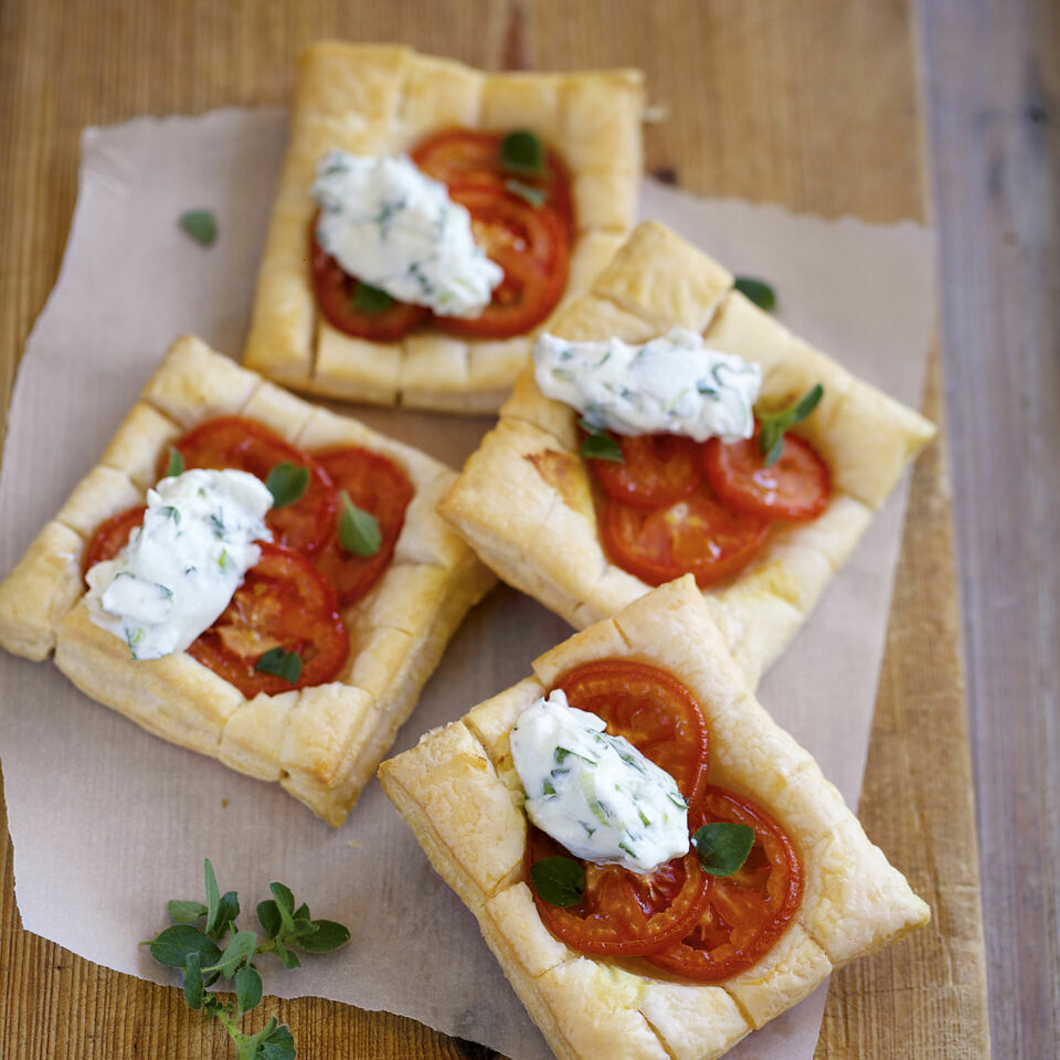 Den Backofen auf 200° vorheizen. Die Blätterteigstücke auf einem mit Backpapier belegten Blech verteilen. An jedem Teigstück rundherum einen ca. 1 cm breiten Rand einschneiden, dabei den Teig nicht durchschneiden. Den inneren Teil der Teigquadrate mit Senf bestreichen und die Tomaten dachziegelartig darauflegen. Mit dem Knoblauchöl bestreichen, mit Oregano bestreuen, salzen, pfeffern und mit je 1 Prise Zucker würzen. Im heißen Ofen (Mitte, Umluft 180°) in 20-25 Min. goldbraun backen.