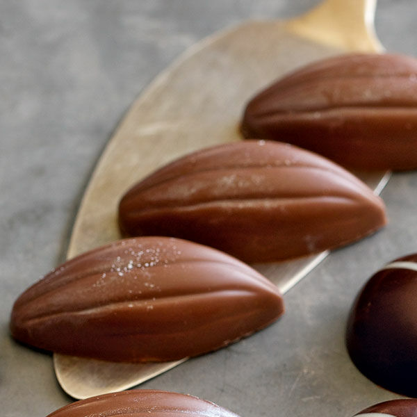 Für die Ganache die Vollmilchkuvertüre hacken. Sahne aufkochen und vom Herd nehmen. Zuerst die Tonkabohne, dann die Kuvertüre zugeben und gut verrühren. Butter unterrühren. Ganache in die Mulden füllen, über Nacht fest werden lassen.