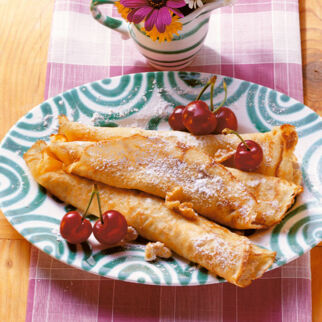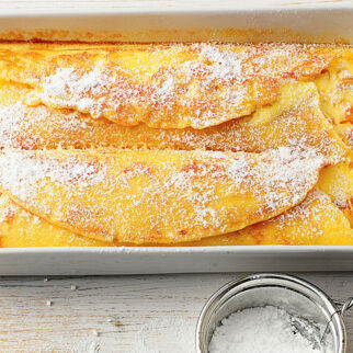 Die Füllung auf den Pfannkuchen verstreichen, aufwickeln und jedes Röllchen schräg in vier Stücke schneiden, leicht überlappend nebeneinander in eine feuerfeste Form legen. Restliches Ei mit saurer Sahne oder Crème fraîche und übrigem Vanillezucker verrühren, darübergießen. Palatschinken etwa 25 Minuten im Ofen (Mitte) backen. Vorm Servieren mit Puderzucker bestäuben. Dazu passt Kompott.