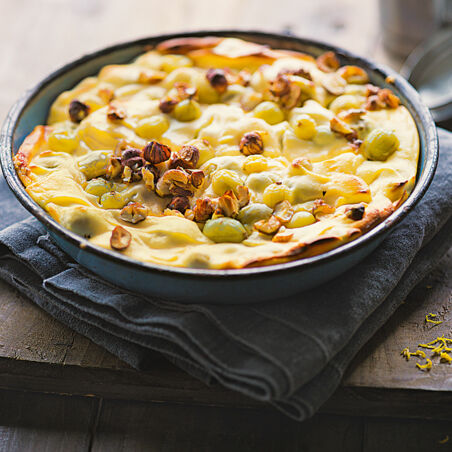 Die vielleicht leckerste Art, Stachelbeeren zu genießen: Servieren Sie den wunderbar cremigen Quarkauflauf am besten noch warm.