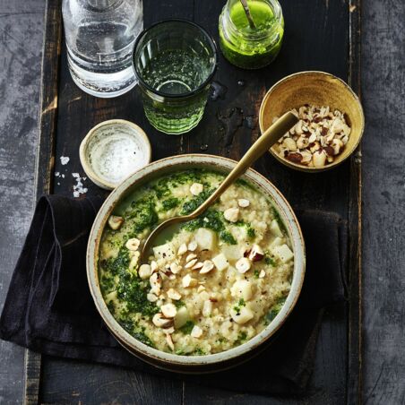 Graupen tragen ihr Image als Eintopf-Langweiler vollkommen zu Unrecht – das beweist dieses Graupen-»Risotto«. Denn langweilig ist hier nichts: cremiges, aber bissfestes Getreide, nussiger Topinambur und zusätzlicher Nuss-Crunch!