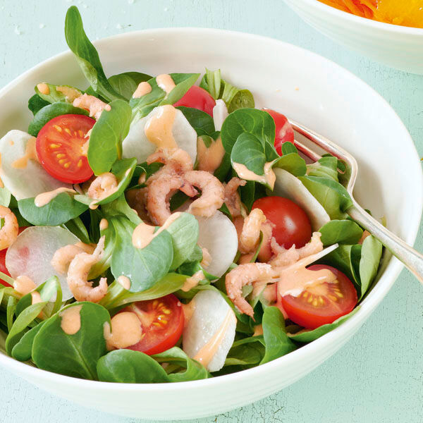 Topinambur, Krabben und Feldsalat vereint in einem köstlichen, gesunden Salat und angemacht mit einem raffinierten Dressing aus Tomatenmark, Sahne, Öl und Zitronensaft.