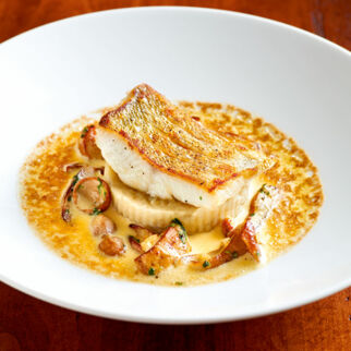 Abgießen und etwas ausdampfen lassen, dann durch die Kartoffelpresse drücken. 3 EL Butter würfeln und mit der Crème fraîche mit dem Schneebesen unter das Topinamburpüree schlagen. Das Püree mit Salz, Pfeffer und Muskat abschmecken.