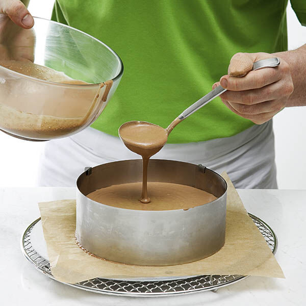 Für die dunkle Schicht 200 g Sahne steif schlagen. Zartbitter-Schokolade schmelzen. 1 Blatt Gelatine 5 Min. in kaltem Wasser einweichen. 1 Ei mit 2 EL Wasser über einem heißen Wasserbad schaumig schlagen, Gelatine darin auflösen. Flüssige Schokolade unterrühren. Schüssel vom Wasserbad nehmen, Schlagsahne unterheben. Dunkle Mousse in den Tortenring auf den gebackenen Boden gießen und ca. 40 Min. ins Tiefkühlfach stellen.