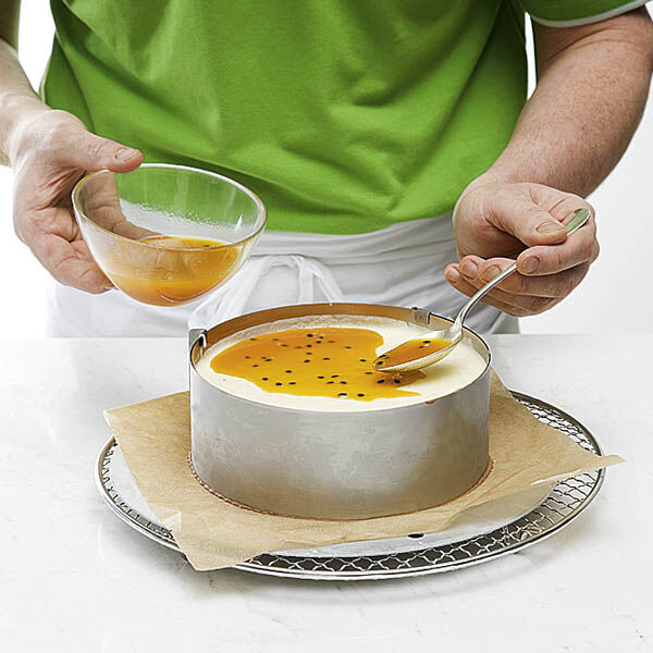 Für das Gelee Passionsfrüchte halbieren, auskratzen und mit Maracujasaft erhitzen. Restliche Gelatine einweichen und im heißen Saft auflösen. Leicht abkühlen lassen und auf der weißen Mousse verteilen. Torte mind. 2 Std. kühl stellen, dann servieren.