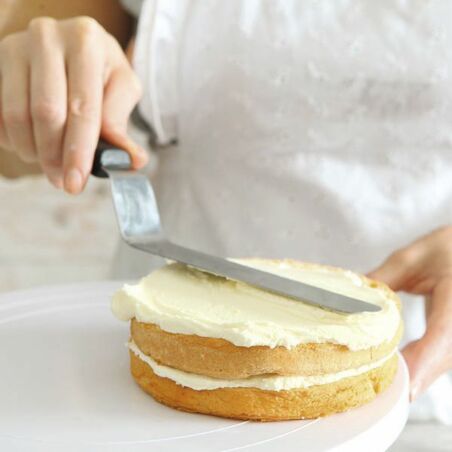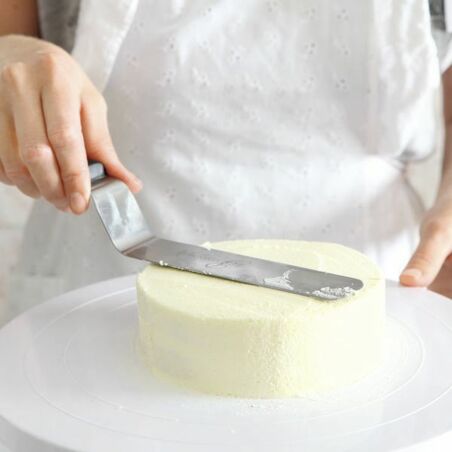 Den gefüllten Tortenboden auf die Tortenscheibe setzen und diese auf den Drehteller stellen. Knapp ein Drittel der Buttercreme auf die Torte geben.
