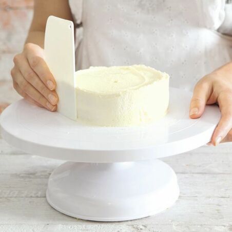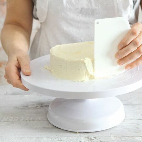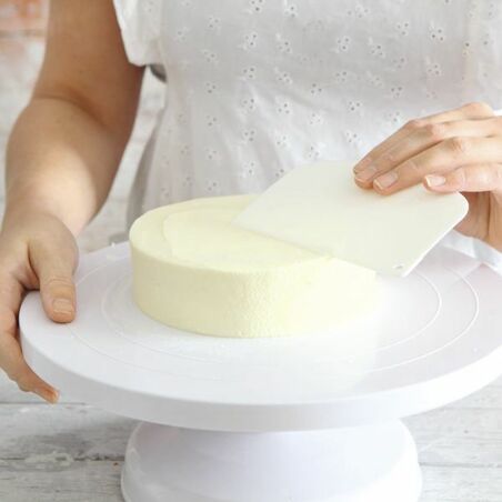 Mit einer Hand die Teigkarte gerade halten, mit der anderen den Drehteller ein Stück drehen. Wiederholen, bis der Rand der Torte glatt ist.