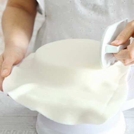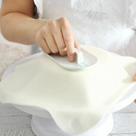 Die Fondant-Platte über die Torte legen und die Oberseite mit dem Glätter glatt streichen.