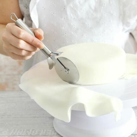 Fondant rundherum mit dem Pizza-Schneider grob kürzen. Überstehende Fondant-Ränder erneut andrücken, glätten und gerade am Rand abschneiden.