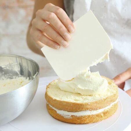 Torte 1 Std. kühlen, dann mit der übrigen Creme einstreichen. Dabei die Teigkarte am Tortenrand und zugleich auf der Tortenplatte gerade ansetzen.