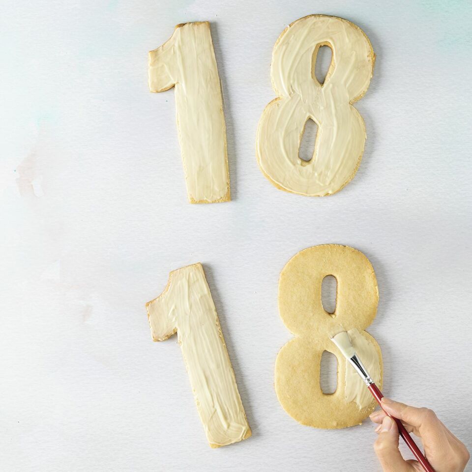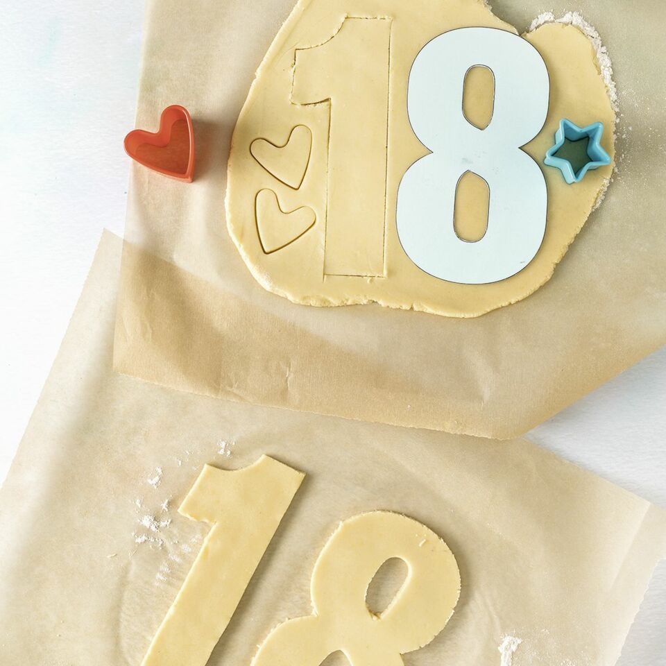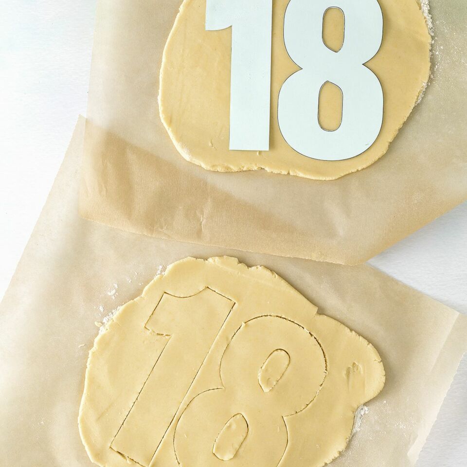 Den Teig in zwei Portionen aufteilen und auf Backpapier jeweils 4 mm dick ausrollen. Die gewünschte(n) Zahl(en) mittels Schablone je 2-mal ausschneiden.