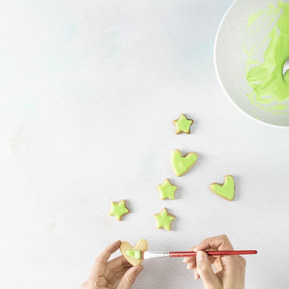Puderzucker mit Zitronensaft zu einer zäh fließenden Paste anrühren. Mit Lebensmittelfarbe hellgrün einfärben. Kleine Kekse damit bestreichen und trocknen lassen.