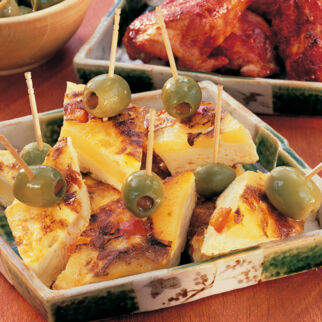 2 EL Olivenöl in einer breiten Pfanne erhitzen, die Kartoffeln darin portionsweise 10 Min. braten, dabei ab und zu vorsichtig wenden. Auf Küchenpapier entfetten, salzen und pfeffern. Gleichzeitig in einer zweiten Pfanne 1 EL Olivenöl erhitzen, die Zwiebeln darin glasig 6-8 Min. dünsten, dann Knoblauch und Chilis 2 Min. mitdünsten. Paprika untermischen. Alles etwas abkühlen lassen.