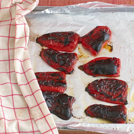 Den Backofen auf 220° (200° Umluft) vorheizen. Die Paprikaschoten vierteln, entkernen und waschen. Ein Backblech mit Backpapier auslegen. Die Schoten mit der Schnittfläche nach unten darauf legen. Die Paprika im Ofen (oben, mit Grillfunktion) etwa 20 Min. grillen, bis sie schwarze Stellen und Blasen bekommen. Herausnehmen und mit einem feuchten Küchentuch bedecken. Nach 10 Min. lässt sich die Paprika ganz leicht häuten. In Streifen schneiden.