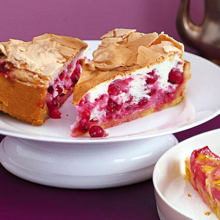 Inzwischen für den Belag frische Johannisbeeren abbrausen, trockentupfen, von den Stielen streifen. Eiweiße zu sehr steifem Schnee schlagen, Zucker dazugeben und weitere 5 Min. schlagen. Speisestärke unterrühren. 3 EL Eischnee abnehmen und beiseite stellen. Beeren behutsam unter den Rest Eischnee heben.