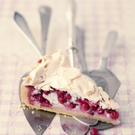 In der Zwischenzeit für den Belag die Johannisbeeren abspülen, trocken tupfen und von den Rispen streifen. Die Eiweiße sehr steif schlagen, den Zucker dazugeben und weitere 5 Min. schlagen. Die Speisestärke dazusieben und unterrühren. 3 EL von dem Eischnee beiseitestellen. Unter den Rest behutsam die Beeren heben.