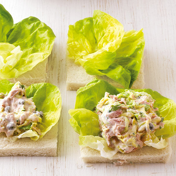 Die Brote entrinden. Salat waschen, trocknen und die Mittelrippen flach schneiden. 4 Brotscheiben mit je 1 Salatblatt belegen. Thunfischmischung darauf verteilen und verstreichen.