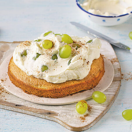Inzwischen für den Belag die Trauben waschen, trocken tupfen und von den Stielen zupfen. Die Sahne steif schlagen, dabei Sahnefestiger, Vanillezucker und Puderzucker einstreuen. Den Schmand unterrühren und die Trauben unterheben. Die Traubencreme leicht kuppelförmig auf den abgekühlten Kuchen streichen. Mit Zimtpulver bestäuben.