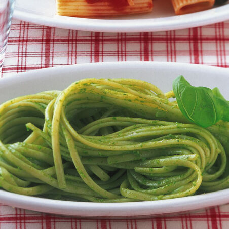 Pinienkerne ohne Fett rösten. Basilikum waschen und trockenschütteln, die Blätter abzupfen. Knoblauch schälen. Alles mit dem Parmesan im Mörser oder mit dem Pürierstab zu einer Paste pürieren. Öl unterrühren, salzen und pfeffern. Nudeln abgießen, nicht abtropfen lassen. In einer angewärmten Schüssel mit Pesto mischen.