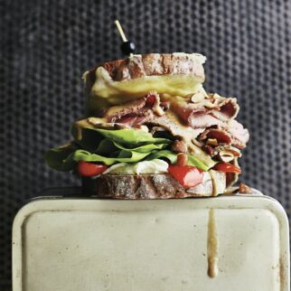 Die Brote aus dem Grill nehmen und die oberste Scheibe zur Seite klappen. Rucola und Schmorzwiebeln auf dem geschmolzenen Emmentaler verteilen, die Stullen wieder zusammenklappen und warm servieren.